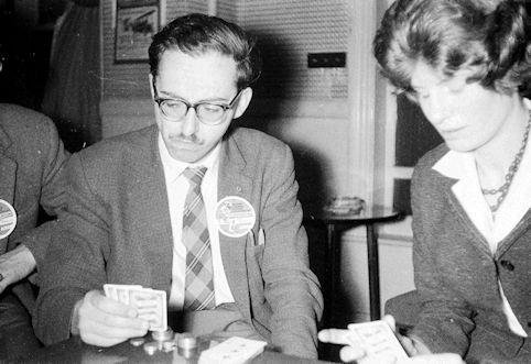 This was a very quiet party at first. Until people began breaking away from the other one there was only a handful there. We talked seriously about a great number of things fannish, and listened with awe to the sound of a typer coming from the next room where some fan was already bashing out a con report. Then gradually more people came in and it became impossible to sit less than eight to a bed. About five o'clock people had begun to drift away again until just Walt, Ian and myself were there and Ethel stated her intention of going to bed. Ella also said she needed her sleep otherwise she'd be a sight in the morning. I had a choice of replies to this, but refrained from making them and merely said that in my opinion anyone who went to bed at all on the second night of a convention was sissy and effeminate. Oddly enough, neither of the girls objected to being called effeminate. We were all hungry again and went down to the kitchen on the off chance that the staff had forgotten to throw out some crusts. I don't know how the others felt, but I was hungry in italics. In the kitchen we found the walls, ceiling, floor and fittings streaming with water and clouds of steam hanging in the air. Obviously there had been a recent catastrophe with the hot water boiler. We waded out carefully and went to the small lounge, where a group containing Ron Ellik and Ron Bennett were playing cards. RON ELLIK: During the night, as least the following people sat in from time to time: Norman Shorrock, Ron Bennett, Liz Humbie, Phil Rogers, Sid Birchby, Dave Barber, Pat Kearney, Jill Adams and myself. I don't believe more than six of us were at the table at any one time; if anyone else joined, he was there for only a brief span. By this time I had gotten the hang of the game -- you don't play your cards, you play your opponents'; I was winning fairly regularly, and if Norman had thought I was keen the day before, he was goggle-eyed at my enthusiasm for the game when I began raking in chips -- HIS chips. He played casually, as always, and won heavily from Bennett on some of the most fantastic hands I've seen: hands where the bet went up to a pound, where pots often totalled more than five pounds, and where tension all around the table was incredible. I learned how to be out-Bragged, and I learned how to laugh insanely at my cards no matter what; but mostly I learned how to rake in Norman's chips.