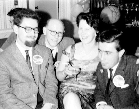RON ELLIK: In the evening Eric Bentcliffe and I entertained the (seemingly) entire mass of attendees with a talk about TAFF, its future and its problems. We had quasi-rehearsed this at Eric's home a few days before, and it went off like clockwork, corny jokes and all. In fact, I daresay I have never played to a better audience. One of the most interesting outcomes of this talk was a short list of American fans whom the British would like to see nominated for TAFF -- it amounts to a mandate. Later a mob filled the West Park assembly room (where the fancy Dress Ball had been held) to watch a Guinness movie, 'A Matter of Life and Death'. Then we all charged over to the Clarendon for a wine-and-cheese party, brightened considerably by some of the hoariest old silent pictures I have ever seen -- Tarzan from before Weismuller, and Popeye cartoons like you have never imagined. When the cheese and movies ran out, I found myself in a flying wedge headed for the lobby of the West Park and -- you guessed it. That game was an extraordinary event in itself; we must have settled down around midnight, when someone asked us if we intended to stop early or late. We replied that the cards would stop being dealt when the sun's first rays illuminated the lobby; and we paid no heed to cries that the lobby opened westward. JAMES WHITE: After "A Matter of Life & Death" the Cheltenham Group showed old con movies and Tarzans. The only other things I can remember about this party are that everyone seemed to be enjoying himself, that at one point there was a loud splintering crash from somewhere, and that everyone watching the movies had either to sit or lie on the floor because the screen rested on a chair little more than a foot above floor level. This horizontal rather than vertical distribution of bodies made walking and talking remarkably difficult. Brian Aldiss and Harry Harrison were in the lounge feeding meat pies to a crowd of emaciated fans. Brian had been charged 2/6 the previous night for one sandwich so tonight he had imported his own food. I heard later that he had grilled them in a metal wastepaper basket, but when they arrived they were going like -- dare I say it -- like hot cakes, I managed to get one just before Brian Burgess took off with the last dozen with some idea of auctioning them at the other party. Hearing that there was another party, in Ethel and Ella's room, I went looking for it and met Walt and Ian doing the same.