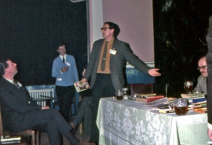 RON BENNETT: The meal was followed by a welcome session in the Convention hall, at which Dave Kyle briefly introduced the members of the Con Committee and the better-known professionals present, Ron Whiting, James White, Harry Harrison, Brian Aldiss, John Brunner, Ken Bulmer, Ted Tubb, Tom Boardman and John Ramsey Campbell. These worthies then conducted an auction which was followed by a party thrown by the Bristol Group.