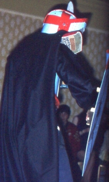 Back in the Con hall the Fancy Dress Party was getting under way, with an average of three photographers for every competitor. Brian Burgess should have won the special prize for his impressive suit of armour - which made him look about twelve feet tall - instead of the imaginative but simple plastic Black Cloud worn by Tony Walsh. Later, Brian's armour proved itself in battle when he and Ted Tubb featured - actually their features were steaming gently inside their helmets - in the Grand Jousting Tourney, during which they broke two shields and three swords trying to prove that the other one's armour could not take it. The welkin rang with the clatter of sword against hardboard and blood ran freely from skinned knuckles, but there was no clear decision, so they raised their visors and called it a knight.