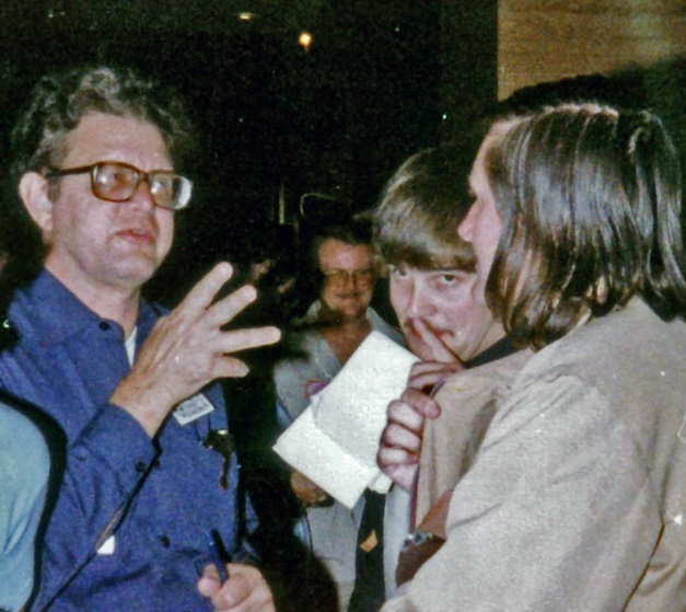 PETER NICHOLLS: I was not alone hoping to meet the rich and famous. Every time I went off in search of them, usually finding them in large clusters in close proximity to their natural nutrient, free booze offered by publishers in extravagant suites, I found that little Mal had got there first, calling Frederik Pohl Fred, Laurence van Cott Niven Larry, but not making my mistake of calling Chelsea Quinn Yarbro Chelsea (she's called Quinn). (Incidentally, my only contact with Alfred Bester was quite enigmatic... I was crossing the bar trying to hold five drinks, and Bester came up and took them from me. "Here," he said soothingly, "let me carry those for you. You look very tired." This from my long-time hero, a man 26 years older than me, was bad for morale.)