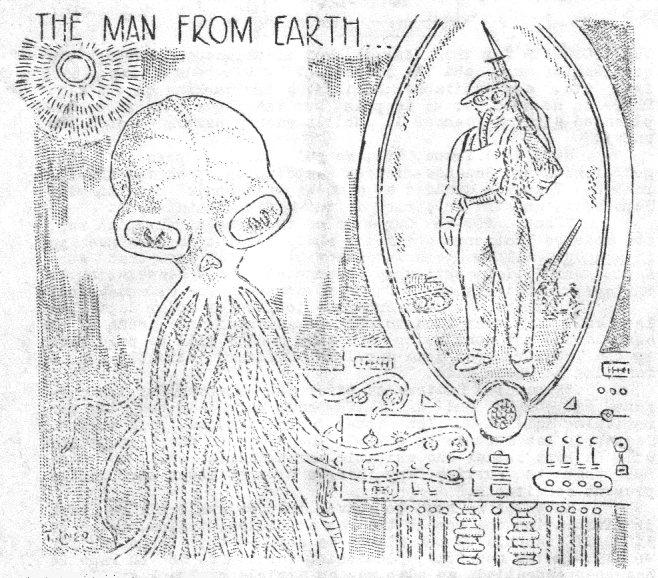 This "epic" was reproduced from the July 1938 issue of IMAGINATION, that great little magazine issued by the Los Angeles fellows. Ray Bradbury would have us believe that it is pronounced "Loose Angeles."DEAR STUDENTS OF SCIENCE: I have been reading a book by a fellow named Darwin called "The Organ of the Spices." I find that a planet is a body of earth surrounded by sky. Interesting? (Sound of shot). Mr. Darwin wrote: the bones of the head are frontal, backal, sidal, topal and bottomal. We also have anterior, posterior, bacteria, and cafeteria. A human passes through all the life stages from infancy to adultery. Interesting? Sit down and stop reaching for your guns - I mean, ray pistols. Did you know that mushrooms grew in damp places and therefore look like umbrellas? Did you know that the three parts of a grasshopper are the head, abdomen, and borax? Gravity was discovered by Isaac Newton. It is chiefly noticeable in the autumn when the apples are falling off the tress. Before Newton made this discovery it is believed that there was no fall at all -- but the winters were long. Egad! What discoveries I have made! List of my list of listless things. To remove air from a flask, fill the flask with water, tip the water out, and put the cork in quick. Water is composed of two gins--oxygin and hydrogin. Oxygin is pure gin, hydrogin is gin and water. The tides are the result of a fight between Newton's gravity (see above) and that of the moon. All water finds the moon very attractive, because there is no water there and nature abhors such a vacuum. Gravitation at the earth keeps the water from rising all the way to the moon. If gravitation ever failed in this job, the man in the moon would become a water boy. I forget where the sun joins in the fight. Three stages of water are high-water, low-watar and break-water. Nitrogen is not found in Ireland because it is never found in a free state (ouch!) When you breathe you inspire. When you do not breathe, you expire. A circle is a round line with no kinks in it, joined up so as not to show where it began - it sort of meets its other end without ending, if you know what I mean. A polygon with seven sides is known as a hooligan. It is also a dead parrot. Now that we have cleared that up nicely and you have all turned over in bed to get a match with which to conflagrate this page (but be careful not to burn the other side), I should like to explain a little about the peoples of the world. Did you knew that the Eskimos are God's frozen people, or that they wear es-kimonos? The