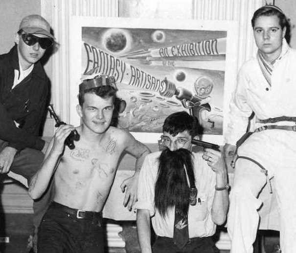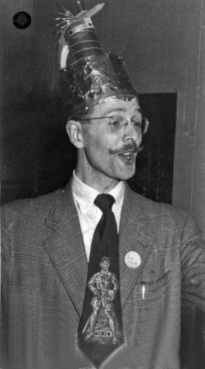 As a result of cartoons by Ray and others such as Lee Hoffman, drawing the propeller beanie on a figure became visual shorthand for a fan and some fans started wearing them to conventions. Several took this further by having multiple propellors on their beanies. Roles decided to take it to the limit and subvert the form entirely with his 'atomic' beanie. Whether this was also intended as a commentary on the arms race is unknown. The tie he's wearing features the famous image of one of E.E. 'Doc' Smith's lensmen as painted by Hubert Rogers for the cover of the October 1939 issue of Astounding Stories.