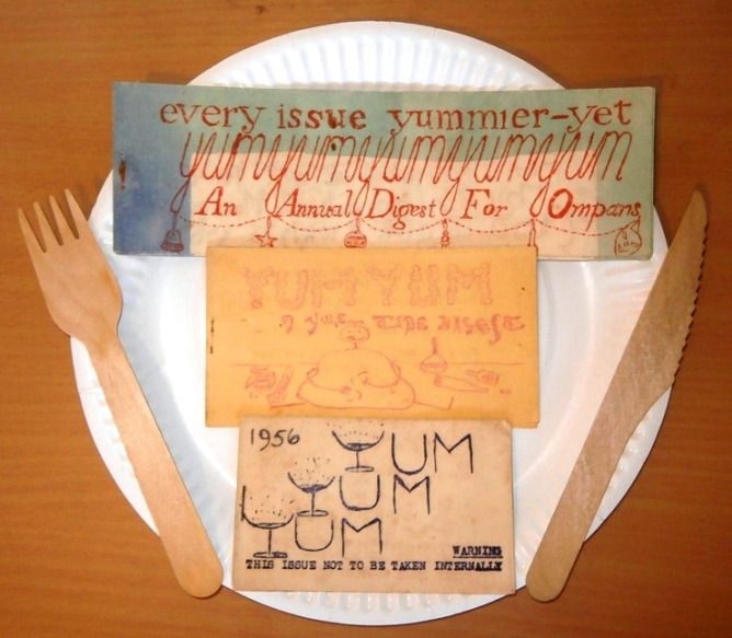 YUM YUM, YUM YUM YUM, YUM YUM YUM YUM, & YUM YUM YUM YUM YUM (1955-58) Subsequent iterations of YUM were issued every December with the second being titled YUM YUM, the third YUM YUM YUM, and so on. Printed using multi-coloured ink on multi-coloured paper in a dazzling variety of combinations not all of which were entirely successful, these tiny publications were prime examples of the fanzine as artefact, small objects of desire. And all non-edible. Yet none of them was the smallest fanzine ever produced. That honour probably belongs to the one Forry Ackerman stamped out on individual dog tags during WW2, none of which are known to have survived.