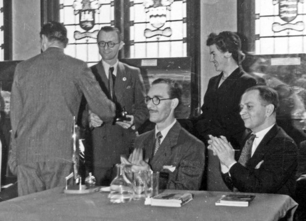 CLARKE: No-one ran around screaming with enthusiasm at the announcement of the fiction trophy's destination -- John Collier's little known book of fantasy shorts, 'Fancies & Goodnights', though Secretary Les Flood consoled s-f fans with the news that 'Day of the Triffids' by John 'Wyndham' (Beynon) was a close runner-up. There was no doubt whatever about the book for the non-fiction award, Arthur Clarke's 'Exploration of Space'. Arthur's brother and sister-in-law (who types his mss.) received the spaceship-and-table-lighter trophy on his behalf, and Ted Carnell stood in for Collier. A long break followed the award -- an opportunity rarely given at English Cons for fans to get together. During this period I met numerous Sunday-only visitors, including bibliophile and former actifan Richard Medhurst at the first fan meeting he'd attended for 9 years. (Mem. for future cons, advocate this lapel-button-with name idea!), and spent some time at the 'Authentic' display stand, where Editor Campbell had not only assembled his 'zines, cover-originals etc., but also many items of interest such as fanzines, author photos, etc.
