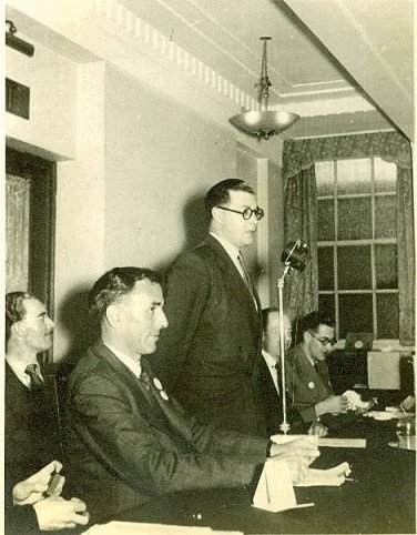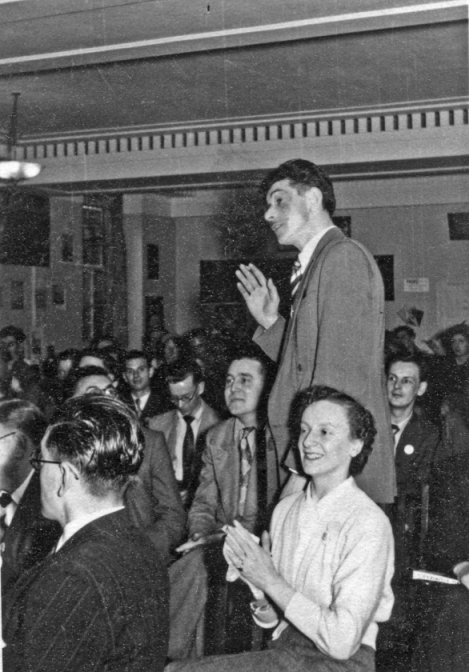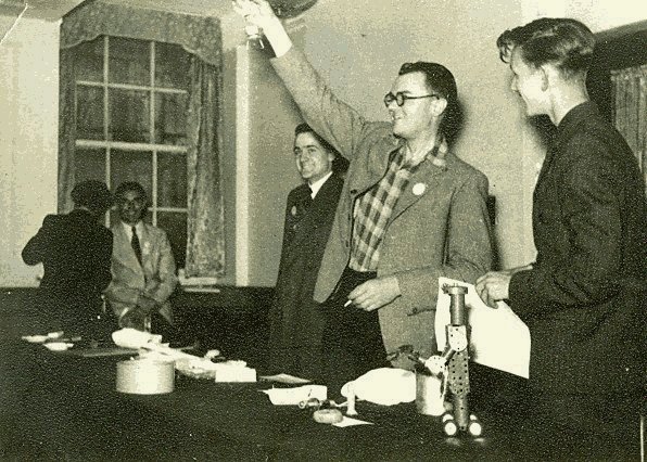 WILLIS: The Convention was due to start at 11am, and we took care and a taxi to arrive shortly afterwards so that in the event of its actually starting on time we should be on hand to carry out those who had fainted from the shock. But all was well ---at 11.30 Ron Buckmaster was still asking everyone if they had seen the microphone. Evidently someone, probably a Northerner, had taken the mike out of the Convention already. Someone suggested he should call for its return over the PA system. While the Committee were mulling over this we all milled around to the strain of Stan Kenton records. At 11.43 precisely Chairman Fred Brown apologised for the delay. He offered no explanation, and nobody expected one. He also announced the last minute cancellation of the showing of 'Destination Moon, due to the London County Council's unexpected objection to the showing of inflammable 35mm film in unlicensed theatres. Eviidently the Government had sneaked through the Cinematograph Act of 1909 without informing the Convention Committee. He also read a postcard from Peter Hamilton regretting that he might not be able to be present. Since Peter was actually standing just under the Chairman's nose, it looked as if he had delivered the postcard himself to save postage. Fred also announced the cancellation of the Junior Fanatics play, adding rather tactlessly that something better would be substituted.