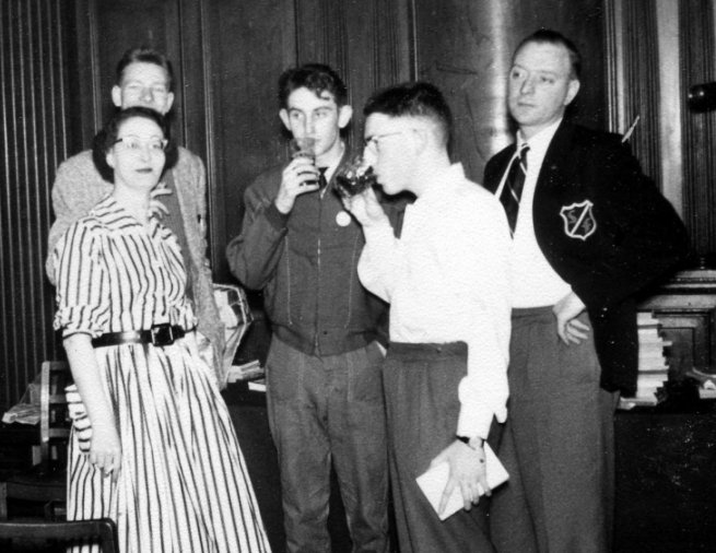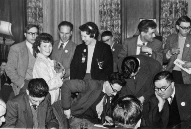 JORDAN: We had all been told the number of Pete's room and that there was to be a party there. Eventually we reached it, way up at the top of the hotel, surrounded (roomwise) by mundane types. The hotel was large and rambling, so the manager had naively spread us all through it. Slowly a party began to take shape as people filed in. Some of the folk around were Pete (of course), Ron Bennett, Dave Cohen, Arthur(Doc) Weir, (who saved the evening by producing a corkscrew in a moment of great need), and more, but more. MAYNE: Eventually, we decided, it was time to look in on Pete's party, but there was nobody in his room, It wasn't long after twelve, so obviously the party hadn't finished yet. Ina did one of her celebrated reccies and located the party in Ella's room. Apparently the manager had come round to Pete's room complaining of the noise, so they had all moved down to more fannish territory. It was quite a Party too. Norman Shorrock and I managed to wedge Ron in between the washstand and the wall and started explaining to him why he was Penelope Fandergaste. Then Ron got freer and started explaining to us why he wasn't Penelope Fandergaste. Then the three of us and Archie Mercer went downstairs to get coffee. The talk now was of fannish matters generally, and pretty soon everybody from the party had come down to join us. I think it was about 4-30 when that session broke up and people moved on to start playing brag etc.