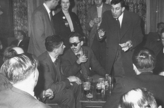 BENNETT: Friday's session was one of informal meetings. I met Jim Linwood and Brian Jordan for the first time and renewed acquaintances with Norman and Ina Shorrock (whom I had not seen for three whole weeks), Pete Taylor, Dave Cohen, Ken Potter, Ken Mclntyre, Ella Parker, Bobbie Wild, Bob Richardson, Eddie Jones, Sandra Hall, Ivor Mayne, John Roles, Paul and Joan Hammett and Norman Wansborough. MAYNE: The crowd of us went back downstairs and settled round a small table. Jhim and I wanted to talk about things generally since our last meeting had been some time ago. This was the first time we'd met Brian Jordan, so we all had a lot to talk about. In a way, it was just like the Globe, with the younger fen sitting on their own around a table and all the other fen talking round another. Later our little group broke up and Jhim and I spoke to Norman Shorrock and Ron Bennett. Ron, of course, was selling subscriptions to PLOY and The FanDirectory. No old mags this time, but he's got a new racket in TAFF. I hope nobody was stupid enough not to give money to a nogood character like Bennett. When the bar opened all the fen gathered round it - natch! Norman Shorrock was distributing copies of the programme, a very well produced book of 40 odd pages, and I do mean odd! JORDAN: We got quite a shock, when we found that a rumour which had been going round, proved to be true - the bar was to close early, in spite of previous promises that drink would be available most of the night.