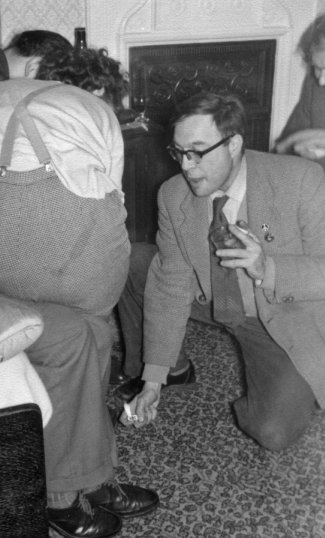 MAYNE: Someone rashly mentioned to Pete Taylor that nothing much seemed to be happening so he decided to hold a party. He dragged me out with him to help him get the bottles back to the hotel. Getting them back was okay, it was getting them IN that was the trouble. The staff weren't particularly friendly - you've gathered? - and we hated to think what they'd do if we walked in with £9's worth of booze. While Pete stayed outside to look after the other stuff, I stuck one bottle into my pocket and two others under my coat. I walked straight through the lobby and upstairs to Pete's room, I'm sure that both the hotel staff and fen gave me some peculiar looks, but I didn't dare look round to see. After leaving the stuff in Pete's room, I found Ina and told her the mess we were in. Ina came out and helped carry some more in and then Joan and Paul Hammett drove up and agreed to smuggle the rest through for us in their cases.
