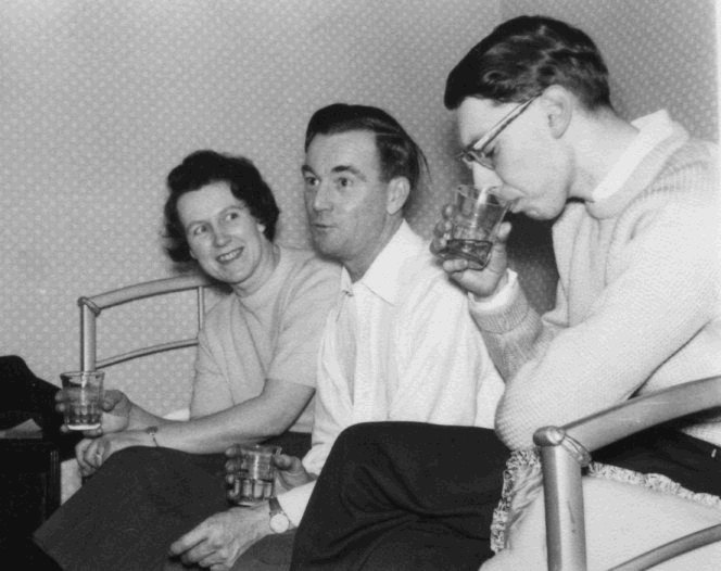 The Hammett's would turn up sporadically throughout the con, and then disappear about five minutes later, muttering something about having to join the Aldermaston march. (They did indeed leave the con at some point to join the annual Easter march from the Aldermaston atomic weapons research establishment to Trafalgar Square in London. Nuclear disarmament was a hotly debated topic in fanzines of the period. For more on the marches see here.) After all that I never got to the party in Pete's room anyhow. I found myself in Bob Richardson's room, along with Norman and Ina, Peter West and Sandra Hall. Quite a lot of the time Pete was there too. We sat around and talked, then listened to a tape Bob had made for Norman.