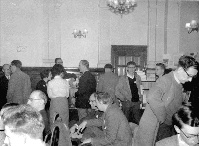 Ted had planned to go on home and left. A few minutes later I was down in the lobby when he called me over to where he and Dave Kyle were talking to a Miss Bellamy, a newspaper woman from New Hampshire somewhere. She was hipped on flying saucers and had noted the s-f con on the lobby bulletin board. It just so happened that she was on an European tour and was staying at the Kingsley. She related some of the sightings she'd written about in her newspaper work. The movie, "The Day The Earth Stood Still" was now being shown in the con hall and after her taking a few notes for a possible column in her hometown newspaper, she adjourned to the con hall and Ted got his chance to dart out the door and head for home, now considerably later than he'd anticipated on leaving. BOBBIE GRAY: The professional film stood the test of time fairly well and it was during this film - just beforehand rather that we met an American girl, Ernestine Hope Bellamy, who had actually seen U.F.O.s. I had always kept an open mind about the things myself, but I was curious and we talked to her afterwards about it. And I should like to say right now that Miss Hope Bellamy was no crank, but a very intelligent young lady. DON FORD: I watched the end of the movie and then circulated around a bit. A number of fans were leaving the con, now. Next stop was Ethel Lindsay's room where an OMPA gathering was in progress. ARCHIE MERCER: In spite of'the absence of members who weren't staying at the hotel that night, the room was packed - there must have been about half the OMPA membership there, which is a pretty good proportion, and we had an interesting session. Eventually President Joy wound up the official proceedings of OMPA and we were told to go and fetch any bottles we had in order to convert the meeting into a room-party. I went to fetch my Drambuie, then realised that there was still something missing. "Hold on", I said as I slipped through the door again, "I've forgotten my glass." Mike Moorcook was in the corridor outside, Did I want a glass? He had one right there. He knocked on a door, and Sandra Hall let us in. Mike shoved two bar-glasses into my hands, I thanked him and prepared to depart. "While you're here," said Mike (or words to that effect) - and started talking. I answered. Two or three or five minutes leter I picked up the glasses again and prepared to depart. Mike kept on talking, Sandra helping out occasionally. Eventually I gave in, produced the Drambuie, and we settled down for a session. An hour or two later, when THAT room-party broke up, I returned to Ethel's and Audrey's room to find that it was still fairly lively - but with hardly any of those originally present. That's fandom for you - never any shortage of sidetracks, Dave Kyle was there showing binocular slides of his home - "Viewmaster" or something, 3D style. Looking at these, I discovered that I have something unsuspected in common with Dave - we both live in caravans. I told him that Phil Rogers was another. Dave said he'd met him over the week-end but hadn't suspected it either. DON FORD: Ron Bennett, Sandy Sanderson, Eric Bentcliffe and myself adjourned to my room for a brief TAFF discussion. Mal Ashworth had left. We discussed whether there should be any changes in the TAFF setup for the immediate future and after some discussion decided that only minor changes were necessary; that TAFF had worked in the past and should be able to do so in the future. Next fans started drifting in and before long only standing room was available. Bob Parkinson auctioned off half his beard for TAFF and raised well over a pound I believe. I was chosen as the one to do the job and started hacking away with my razor, saying: "This reminds me of my old job...I used to be an orderly in a maternity ward."