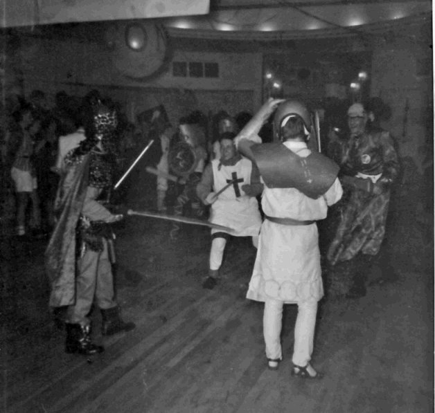 Arthur Thomson called them to order and got them started, a most fearsome sight that struck awe into the bystanders. Tubb, not having a shield made do with two swords. Had I not known he was quite friendly with his opponents, I would have sworn that he had his heart set on killing the lot of them. He would beat about one of them, whilst making frantic back handed swipes at any other opponent who passed within reach. Amis, who had managed to get a seat at the front, was cowering against the back of it. Bob Richardson, dressed in a sort of Mongol outfit, and Don made frenzied efforts to decapitate each other, right in front of Amis, and they didn't seem particularly worried about the possible loss of one of our leading writers.