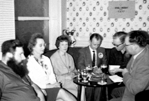Sunday 22nd AprilRON BENNETTKen Slater ran a quiz game on the lines of the radio and TV “Take Your Pick” competitions. The top prize of a bottle of Haig went to Jimmy Groves whilst George Locke won a plastic bucket and bowl and Michael Rosenblum found himself owning a pair of cheap earrings. Other prizes during the weekend were awarded to Eddie Jones for his display on BASTION, to Bob Parkinson for the highest auction bid (£2), to Phil Rogers for spotting the Con’s deliberate poster mistake (directions to the West Park Assembly Room), to Terry Jeeves for the password (this was “Wilson Tucker” and was won when Terry tried to sell Ron Bennett a copy of “The Lincoln Hunters.”) and to several fans for displays in the photo competition. Ethel Lindsay won the “Beautiful Britain” section (with the only entry) and first prize in the “What is It?” section went to Harry Harrison, with Eddie Jones second. Ron Bennett and Eric Bentcliffe won prizes for their pictures of “Fans.” RON ELLIK: Easter Sunday might have dawned gloriously in that northern city, but I didn't know about it until vastly after the fact. I lay insensible, and of course I missed breakfast again -- but that didn't matter, because I was up just in time for lunch. Sunday was a muchly relaxed day, despite piling-up of programme items scheduled on from Saturday; the judging of the photo contest was over before I got to the Clarendon, and I was just in time to go back to the West Park for the BSFA Annual General Meeting. During the AGM I sat still and listened -- the concept of a national fan organization holding all its business during one annual meeting startled me, and I learned quite a bit; I was also entertained by the first competition for the next consite in the memory of British fandom. London had come to Harrogate expecting to take the 1963 con away with them -- but that was because no one has ever wanted a convention in advance, and they figured to break a tradition. Amazingly enough, Peterborough (it's 40 miles north and slightly east of London) also wanted the convention -- so they had to shake the dust off the rule book and actually hold a vote. RON BENNETT At the BSFA’S Annual General Meeting Ella Parker bid for the 1963 Convention on behalf of London and Ken Slater spoke on behalf of Peterborough. It was suggested that the issue be left until the afternoon when the vote would be taken. Discussion on the point took place informally at lunchtime and after the Professional Panel the vote was taken, the return being Peterborough 39, and London 23. It was generally agreed that poor presentation of a worthwhile scheme for a prestige hotel swung the favour to the Peterborough backers. The BSFA’S new officers took over at the AGM with Terry Jeeves stepping up to take over as Chairman for the coming year. Bobbie Gray was elected Vice-Chairman and Jill Adams took over as Treasurer from Ted Forsyth. Ken Cheslin was elected Secretary and Jimmy Groves relinquished the post of Publications Officer to Michael Rosenblum and Ella.Parker, two experienced publishers who will have the job of putting out VECTOR, and the BSFA NEWSLETTER. Peter Mabey continued as Librarian and reported in detail of the Library’s standing saying that it is now the largest SF lending library in the world.