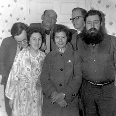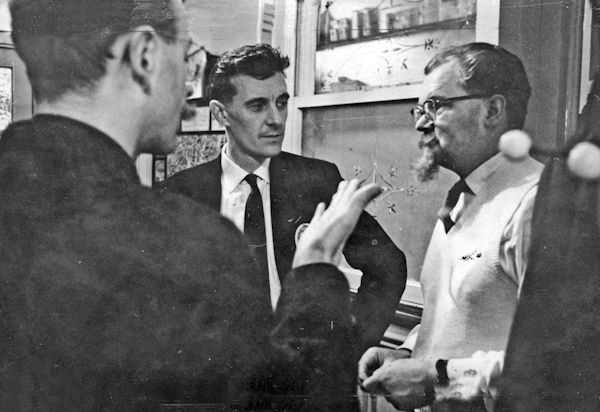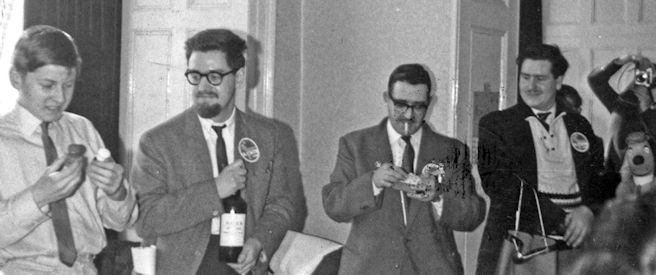 In this incident I learned the meaning of geyser -- it's a small, wall-mounted water heater, gas-operated. This was what had been on the wall above the sink at the Bentcliffe home, but it was metal and I didn't understand its use; it must have held at least three imperial quarts, while the West Park's geyser held perhaps one, to be used for single pots of tea or to infuriate Ron Bennett. And so we mopped up, and Norman started the just-full geyser heating, and Liz helped Sid fix tea and coffee. As I was carrying my fourth tin of water from the room, I noticed the water beginning to bubble, and pointed it out to Ron. "Don't pay any attention to the dirty little thing," he snapped. "You have to wait until that little red light goes out." And, since he has one just like it at home, I took his word for it. On my next trip with a tin of water, as we were getting the last of it off the floor, I mentioned to Ron that the water was coming to a gentle, rolling boil. "When that light goes off," he said, "the water is ready. It has a thermostat which clicks the light off at just the right time." He was still shaking from his hysterics about shutting the thing off, so I made another trip. As I re-entered the kitchen, I saw steam rising from the far wall and boiling water spurting out the top of the geyser; nobody else was paying it any attention. "Ron!" I shouted, "the geyser is boiling!' He looked at me as if I had not a brain left. "That red light --" he began, and turned to look at it. "Oh, my ghod!" he screamed, suddenly hysterical again, "that light must mean it's finished heating!" And with a cry of "But I have one like it at home!" he leaped across Dave Barber and grappled once more with it -- only this time every control was being doused with scalding water, and it took a seeming eternity to get it under control. He had no help this time, because one and all we stood gasping for breath, holding our aching ribs and nearly collapsing with laughter. And of course we had to mop up again, but Bennett and I had to go to the lavatory about this time. When we returned, nearly recovered, the group was put into fresh paroxysms of hilarity by Sid Birchby, who unthinkingly picked up an unusual spoon, with half the bowl missing for some reason, and attempted to spoon instant coffee with it. He stood there inanely with coffee spilling out of his utensil, while we stared, and pointed, and laughed. From then on to dawn, someone might say spoon, or water, or geyser, or "I have one just like it at home," to find gales of laughter. At dawn the Irish boys descended from a party in Ella and Ethel's room which had lasted the night, and we told them the story. JAMES WHITE: Ron Bennett stopped long enough to reassure us that the slight dampness in the kitchen was nothing to worry about and that the boiler had been unco-operative the first few times he had handled it, but now it knew who was boss. He also said he knew where there was some instant coffee and offered us boiling water prepared personally by the hands of the Convention Chairman. While we were drinking this glorious, warm stuff, Ron Ellik gave us the details of how the other Ron had tamed the boiler. Not wanting to steal his thunder -- boilers make an explosive, hissing noise when they blow up in any case -- and in an effort to avoid puns with "highest steam" in them, I will not repeat them. Ron went back to his brag and we began debating whether or not we should go to bed, deciding finally that we were all too hungry to sleep. Walt, Ian, the fan who climbs drainpipes and compares me with Hal Clement, and myself were beginning to brood about the injustices of the world and society in general, our thoughts being strictly from hunger. Then Ian, Walt, and the drainpipe-climber from Oxford left me in a last desperate attempt to find food....and stumbled on an unlocked refrigerator. After we had made a large dent in the contents of the refrigerator and left some conscience money behind to cover the cost, we all felt more like ourselves. But still we were not completely happy. Possibly it was a sense of loneliness that ailed us, because we had been used to large crowds of people and now we were only four. The fans playing brag at the table a few yards away were in another world, and didn't count. It didn't feel right being able to talk without raising one's voice, or walk from one end of a room to the other without saying "Excuse me" six times. In any case someone, possibly me, suggested that we wake up Harry Harrison or Brian Aldiss and somebody, me again, thought it was a good idea. We batted it about for a while, discovering that we weren't sure of Harry's room number and that there would be an element of risk attached to waking the Harrison up, and that we had a rough idea where Brian's room was and that he was the type who was invariably polite. It was 6.45 when we left for the other hotel to wake up Brian. His hotel was locked but there was a drainpipe which led past a half-open window which, according to our calculations, opened into Brian's room. The fan who compared me with Hal Clement said that he climbed drainpipes all the time at Oxford and started to scale this one. But drainpipes in Harrogate are made of softer stuff than in Oxford and it began to wobble alarmingly, so he came down without accomplishing his mission. Which was perhaps as well, since we were told later that it had been Margaret Manson's room. Gradually we became resigned to the fact that we would be unable to wake anyone to join our party and we headed back to our own hotel to freshen up before breakfast. The sun was still shining down warmly and the sky, trees and grass had a newly minted look. I think we were all feeling a little poetic and philosophical about things, because it was suddenly borne upon us that when we had gone into the West Park Hotel to see 'A Matter of Life and Death' the local meteorological phenomena had been identical with the conditions around us now. It ma