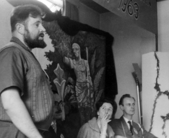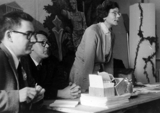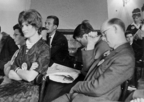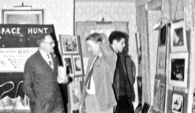 The meeting was, in effect, chaired jointly by Ken Slater and Bobbie Gray - Ken because he was this year's Con Chairman, and Bobbie because she'd been conducting the BSFA business meeting. It started half an hour later than scheduled (people were eating) and gradually snowballed as more and more fans crowded into the little lounge, many of them quitting 'Orphee' (which, though I didn't see any of it myself, I understand called for considerable devotion to fandom on the part of those leaving it) in order to be in on the deliberations. And we argued and we argued and we argued. We argued round in circles, in fact. Somebody would say something, suggest somebody's name perhaps, or ask a question. The suggestee would decline "on the grounds that...", or the question would be answered, Ken or Bobbie would complete the circular argument and start again in the same place as before. More suggestions. More regretful refusals. More questions. And somehow the shape of the circle would subtly shift, as Ken (or Bobbie) started the argument again - from (if it were possible) a slightly different side of the same place. And suddenly the circle was broken. Some subtle shift in the formula some illumination sparked by a casual but pointed interjection from somebody, had left open a way out of the circle. And Tony Walsh - may much egoboo accrue to his name - had agreed to accept the job. If he hadn't, I think we could easily have been there all night. I understand they elect Popes the same way. But I'm damned if I can remember a word that was said - or by who. RON BENNETT: At an extra-ordinary business meeting on the Sunday evening in the Wakeford Lounge a goodly proportion of the attendees gathered to discuss plans for holding next year's convention in Peterborough. Ken Slater pointed out that he could not afford the time away from his business to put on next year's convention but was willing to take charge of professional displays. George Locke said that he would be willing to produce the convention's newsletters and Ken Slater said that he would also be willing to look after the hotel bookings. At the end of the meeting Ethel Lindsay staggered out to find herself in charge of the 1964 programme. She was supported (yes, held up) by Tony Walsh who looked shaken himself - he will wake up to find himself Convention Chairman, Secretary and Treasurer, a formidable combination. Peter West offered to provide and put on the films and is asking anyone to suggest titles of both professional and/or amateur SF films they would like to see next year. How about The Trouble With Harry, Peter? BRIAN VARLEY: After the film, which finished shortly after midnight, there was a small gathering in 258. A dozen or so fans spread comfortably over chairs, beds or floor, a drink in hand, good conversation and a pleasant atmosphere made it a joy to be there. We learnt the Aldiss method for finding plots and this is now available to aspiring writers, price ten shillings, and will be forwarded under a plain brown cover. We would also like to offer Mack Reynold's method but he was too busy trying to persuade someone to play with his toes. Tom Boardman was holding forth on the publishing life in general and the peculiar habits of certain writers in particular. John Brunner was holding forth... Altogether a very pleasant evening and a most enjoyable end to the convention. There is an opinion, widely held, that all parties should be open to all comers, and there is much to be said for the spirit behind this. Personally though I can only truly enjoy a party if there is room to breathe and move in. I attended both parties in 258 and must say that the Sunday evening "closed" session was infinitely more preferable... but then I am speaking from the inside. BRIAN ALDISS: And so the Sunday wore delectably on. Kingsley returned to Cambridge by taxi, most of the rest of us - and that makes about 169 - saw one or both of the two films, "Metropolis", and Cocteau's "Orphee". The latter has most powerful symbols of death and the unknown, but the former was the more popular; in the immortal words of Skyrack, "There were many impromptu remarks from the audience". So the gaiety went on unabated. When Tom and Joyce Boardman dragged Margaret goggle-eyed from "Metropolis", we went and had a drink in the notorious Room Five, where the Brunner's massive dog was just finishing the remains of a delicious fan. Serious discussions then took place, on the subject of whether world conditions had not seriously deteriorated since women were given the vote. On the bed John Brunner and Bruce were entertaining Margaret and Joan Harrison with the exploits of Feghoot. I sold one of my oil paintings to Bruce for an undisclosed sum. Eric Bentcliffe suggested that since people got tired, all-night parties should in future be held during the afternoon.