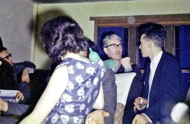 At an undisclosed time of night, Tom Boardman and I decided we should visit Ella and. Ethel in room 258. Unfortunately they were not alone, and the room was full of Jimmy Groves, to mention but a few. The talk there was more intellectual than in the pro room, and we discussed some of the points raised in the speech of Danish fan Harrison (whose cry "Elsinore in '64" had not been taken up). This was a very nice party, and I managed to get on to a bed with Frances Varley; Brian Varley was also there. They voted that I had the best red socks of the Convention, which was some sort of consolation. Eventually Tom and I left; the party was still going strong, and Ethel lay fast asleep on her bed. We went to look up the Harrisons, and found Joan in bed. Margaret joined us, and the five of us had a quiet little session on Joan's bed. It had to be quiet - the children snoozed only a few feet away. The tremendously high level of the discussion deteriorated after a while, notably when I could no longer resist a slice of midriff Joan kept on showing. I pressed a passionate signature to it with my ball-point pen. So Harry got to signing Tom with a sharp-pointed Parker '51. Having been signed and resigned, we resigned from the party, and tottered off to bed. Even the jolly sound of a corridor con upstairs could not lure us, though Tom went. We heard later that Mike Moorcock had been composing a new Elric story, with additions by various hands and censorship by Ted Carnell. Tom bought the result, all rights, for a penny. Last I saw of Mike and Ted, Ted was trying to get his ten per cent.... LANGDON JONES: I wandered upstairs, and walked round the hotel talking and lounging about. I finally wandered into Mike Moorcock's party. Mike was quite worried as I had paid him some money for booze, and then hadn't turned up to drink it. However I got as much of my money's worth as I could. Later I wandered out into the corridor and found a party going full-swing there too, at the top of the stairs. I remember passing Ted Tubb as he was reading the palm of Gerry Webb's girl and saying, "Ah yes, you are a woman of tempestuous passion..." and the girl looking up at him, drinking in every word. For some reason things began to get a little blurry. I remember collaring a bottle from somewhere, goodness knows where. Max Jakubowski was sitting at a typewriter, staring at a sheet of paper containing the words THE SHAVEN SUN. Mighod, thought I, what a wonderful title, I eventually persuaded him to let me type out the story, I got very engrossed in this epic, and just remember being infuriated by some woman called Ina Shorrock, who kept saying, "Ooh, we haven't got one of those on our typewriter..." and pressing all the available keys. Still, I unintentionally got my own back by confusing her with Inchmery. At last I perfected the epic to my own exacting satisfaction, and cried, "Look everybody!" There was silence. I looked up, and found that I was completely on my own, I picked up the typer and staggered downstairs to the lounge. There I found Mike Moorcock, Max Jakubowski, Ron Bennett and Ted Tubb. I gave the typer back, and collapsed into an armchair, I looked at the window, through which the light of dawn was greyly shining, and I thought with satisfaction, "well, at least I'll get breakfast tomorrow." There followed a drunken (at least on my part) conversation on the merits of Bradbury. Suddenly my memory of the conversation cuts off completely. I was manhandled into wakefulness by Ella Parker. The lounge was full of light, and people, I looked desperately at my watch. The time was 10.30 am.