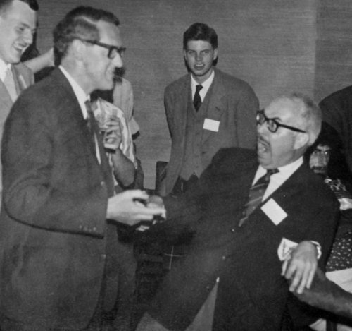 From the audience Judith Merril pointed out that SF comprises modern thinking but not modern literature. Harrison did not altogether agree, pointing out that SF is the harder to write. The SF writer, he said, has to generate a completely new idea and then write well. The modern general writer "has it made." The world, his setting, is there already for him to use. The SF writer has to formulate entirely a new world. John W.Campbell asked whether a writer should concentrate upon the idea to the possible detriment of his writing or whether he should concentrate upon "beautiful prose with lousy ideas" and which should an editor accept, to which point Harrison answered neatly, "You should do as you have been doing." Irene Boothroyd asked how much SF is slanted emotionally at the woman reader, mentioning that in her opinion the amount was not very great. Campbell said that this was a matter of basic economic fact. SF's readership is 95% men, therefore there is a 95% slant towards the male reader. Also men writers far outweighed the number of women writers. Pete Taylor suggested that Campbell produced his magazine in two sections, one slanted for men and costing 47½ cents and the other for women and costing 2½ cents. Harry Harrison suggesting that there could be a small space on the back cover for hermaphrodites! Here the general discussion reverted to the question of whether an editor should concentrate upon good writing or good ideas. Campbell said that as he reads personally every story submitted to him he sees all types of stories, with good and poor ideas and good and poor writing. Whilst he could possibly do better he has to try for the optimum in writing style, grammatical construction and story telling in order to choose the best story for the circumstances.