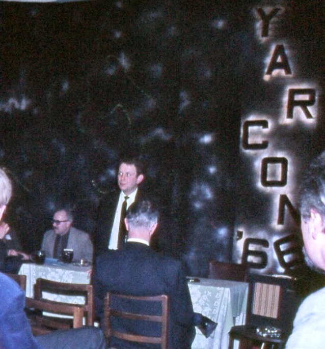 More of Bill Burns's UK con badges here Report below edited together from those written by the individuals noted. Comments inserted by me appear in parentheses or are italicised, or both. Source notes and links to complete, unedited versions of those reports can be found here. The photos presented herein come from a variety of collections, though this doesn't mean a particular picture was taken by that person. The collection photos are from, where known, is noted in parentheses thus: (ns) Norman Shorrock, (sn) Stan Nicholls, (pm) Peter Mabey, (kf) Keith Freeman, (ks) Ken Slater, (te) Tony Edwards, (dk) Dave Kyle, (tj) Terry Jeeves. As always, a tip of the hat to Peter Weston for identifying many of the people in these photos and for supplying them in the first place. Here are links to pages devoted to the individual days and to convention literature.