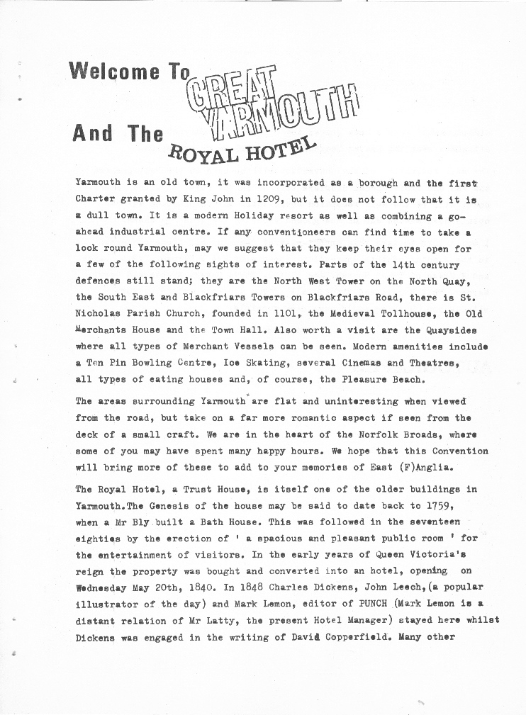 YARCON - THE PROGRAMME BOOKThe Eastercon 1966 Programme Book is 30 pages long (inc. covers), quarto, and tucked inside a green wraparound American quarto size cover. Those pages that are just publishers' ads, tourist info and the like have not been included here. What follows is more or less just the editorial material.No information on Progress Reports, if any.