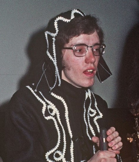 My 1972 Eastercon had an unhappy start — I had to get up early on the Friday morning. (what self-respecting person is even conscious at 6.30am?). After this there came a rush to Kings Cross where the van hired by Ted Ball and Dave Gibson had to be met. As it happened I was almost on time but didn't spot the van at first as I was expecting something much bigger. However, that little surprise was nothing to my feelings when I saw the inside. There was the expected large volume of books from Ted and Dave's shop, Bookends, but quite apart from this, piled on the books were now five passengers and I was told I needn't have worried about being late because, as everyone else expected, Ted was still to come. In addition to all this was the largest single item, filling the entire left hand side of the van, a contraption of painted cardboard. This, Fred smilingly informed me, was his fancy dress costume. When I wondered how a grandfather clock painted all colours was a fancy dress costume I forgot Fred's addiction to puns: Technicolour Time Machine indeed. The lad has a twisted mind.