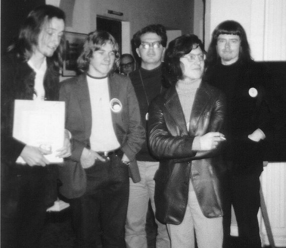 Sadie Shaw, Brian Robinson, Rob Holdstock, Bob Shaw, Don Malcolm, at room party