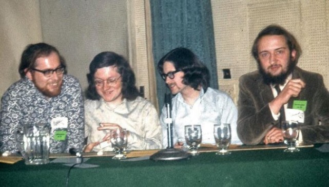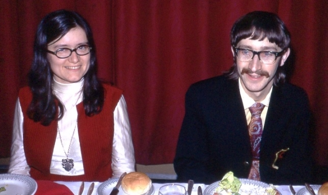 Daughter of Peter & Diane Barrow and so granddaughter of Mike Rosenblum. VERA JOHNSON: I had to skip the next panel, banquet and after-dinner speeches, as I had a booking at the Bath Folk Club, but I got back in time for the showing of "Dr. Strangelove", which I had never seen and although it was late starting and didn't finish until 3:30, I enjoyed it. LEN MOFFATT: After the Banquet, we went back to the meeting room to watch a couple more films. One was a kind of home-movie job (only with fans), showing Phil Rogers's wedding. Another was a fan-made satire about a conflict between Tubb fans and Aldiss fans, quite whacky and mad.
