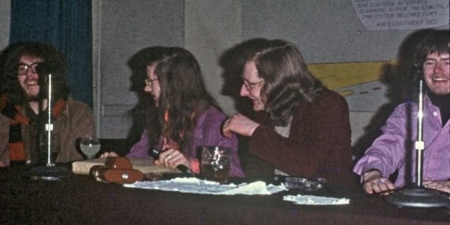 After the AGM I had to appear on Pete Weston's fan panel, along with Ian Williams, Peter Roberts, Jim Goddard, and of course the man himself. I forget what we were discussing, though I'm not sure we knew even then. "Be a bit extreme," Pete hissed to everyone before we began, no doubt realising that the five of us would probably be in substantial agreement on most things, despite his attempt to split us, both physically and philosophically, into two camps: the fannish fans (Ian and Peter Rabbit) and the gimlet-eyed sercon fans (Jim and me). To anyone who's listening I'd like to make another complaint about the set-up of panels at conventions (like the Philip Strick panel, this one I think had the virtue of being well-run and the defect of directionlessness): there are never enough microphones. Admittedly there ought to have been two between the five of us, but one was not working; nevertheless I think a convention ought to be able to get at least four together, so that people on these panels can speak when they have something to say rather than (as always happens at present) when the mike happens to perambulate in their direction. In thit particular instance, I found that whenever the microphone was with Peter Roberts at the far end of the table I had something almost relevant to say, but by the time it had made its way across to me, comments made by the three between us had moved the discussion to an area where I felt I had very little to contribute. Was the same thing happening to the other panellists? Is it general in this kind of situation? If so, is it any wonder that however interesting they look on paper, panel discussions rarely generate anything really worthwhile. I know that if there were more microphones there would be the danger of everybody talking at once, but this might be preferable to the state of affairs when you can't talk when you want to.
