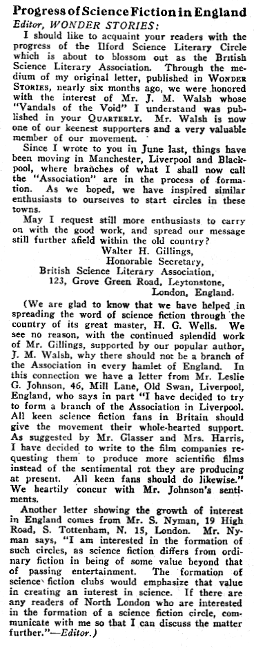 The following letter appears to have been published in WONDER STORIES after the Ilford group's demise. Alas, Gillings' ambition to expand the Ilford Science Literary Circle into a 'British Science Literary Association' came to nothing.