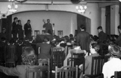WILLIS: The Convention was due to start at 11am, and we took care and a taxi to arrive shortly afterwards so that in the event of its actually starting on time we should be on hand to carry out those who had fainted from the shock. But all was well ---at 11.30 Ron Buckmaster was still asking everyone if they had seen the microphone. Evidently someone, probably a Northerner, had taken the mike out of the Convention already. Someone suggested he should call for its return over the PA system. While the Committee were mulling over this we all milled around to the strain of Stan Kenton records. At 11.43 precisely Chairman Fred Brown apologised for the delay. He offered no explanation, and nobody expected one. He also announced the last minute cancellation of the showing of 'Destination Moon, due to the London County Council's unexpected objection to the showing of inflammable 35mm film in unlicensed theatres. Eviidently the Government had sneaked through the Cinematograph Act of 1909 without informing the Convention Committee. He also read a postcard from Peter Hamilton regretting that he might not be able to be present. Since Peter was actually standing just under the Chairman's nose, it looked as if he had delivered the postcard himself to save postage. Fred also announced the cancellation of the Junior Fanatics play, adding rather tactlessly that something better would be substituted.