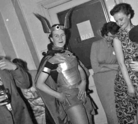 The Liverpool group had decided to make theirs a fancy dress party and had come in costume. This was where costuming first truly started at British cons and some of those costumes were of a quality that wouldn't be matched again - other than by the Liverpool group - for many years. HARRIS: Our first stop was in Room 101 - a single bedroom with more than thirty people packed into it.... fifteen of them sitting on the tiny bed and the rest squeezed in around the walls. Bert Campbell, crammed alongside the washbasin at the far end, was pouring out drinks for anyone who came within range, and everybody was doing their best to keep him fully occupied. Even now, it's still mercifully hazy, but I can remember finding Eric Jones with a tumbler full of hock in one hand and an "Introduction to Elementary Psychology" in the other, and then squeezing past him to find Ina Shorrock sitting on the bed. Last year, dressing sensibly for the Mancunian weather, Ina wore a bathing suit to the Liverpool party, but this year she was much more cautious, and was dressed as a Viking in a winged helmet and a shiny metal corselet. I found a tin opener attachment on the corkscrew and moved in. It was blunt though.... and anyway, Bert wanted it back to open another
