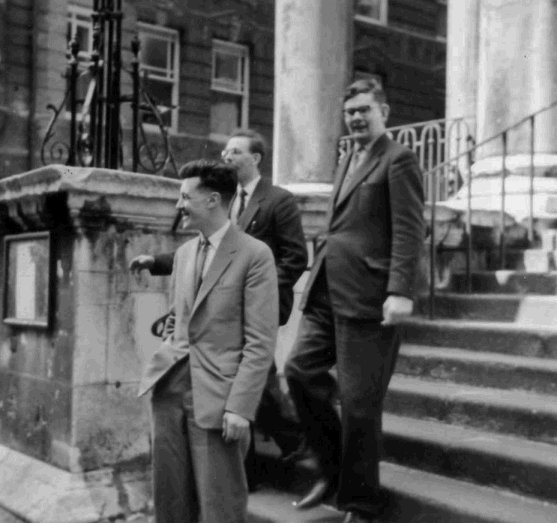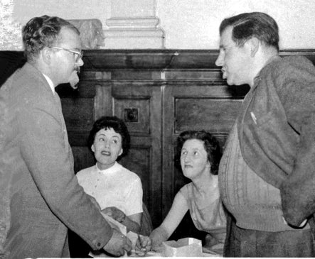 Ted had planned to go on home and left. A few minutes later I was down in the lobby when he called me over to where he and Dave Kyle were talking to a Miss Bellamy, a newspaper woman from New Hampshire somewhere. She was hipped on flying saucers and had noted the s-f con on the lobby bulletin board. It just so happened that she was on an European tour and was staying at the Kingsley. She related some of the sightings she'd written about in her newspaper work. The movie, "The Day The Earth Stood Still" was now being shown in the con hall and after her taking a few notes for a possible column in her hometown newspaper, she adjourned to the con hall and Ted got his chance to dart out the door and head for home, now considerably later than he'd anticipated on leaving. BOBBIE GRAY: The professional film stood the test of time fairly well and it was during this film - just beforehand rather that we met an American girl, Ernestine Hope Bellamy, who had actually seen U.F.O.s. I had always kept an open mind about the things myself, but I was curious and we talked to her afterwards about it. And I should like to say right now that Miss Hope Bellamy was no crank, but a very intelligent young lady. DON FORD: I watched the end of the movie and then circulated around a bit. A number of fans were leaving the con, now. Next stop was Ethel Lindsay's room where an OMPA gathering was in progress. ARCHIE MERCER: In spite of'the absence of members who weren't staying at the hotel that night, the room was packed - there must have been about half the OMPA membership there, which is a pretty good proportion, and we had an interesting session. Eventually President Joy wound up the official proceedings of OMPA and we were told to go and fetch any bottles we had in order to convert the meeting into a room-party. I went to fetch my Drambuie, then realised that there was still something missing. "Hold on", I said as I slipped through the door again, "I've forgotten my glass." Mike Moorcook was in the corridor outside, Did I want a glass? He had one right there. He knocked on a door, and Sandra Hall let us in. Mike shoved two bar-glasses into my hands, I thanked him and prepared to depart. "While you're here," said Mike (or words to that effect) - and started talking. I answered. Two or three or five minutes leter I picked up the glasses again and prepared to depart. Mike kept on talking, Sandra helping out occasionally. Eventually I gave in, produced the Drambuie, and we settled down for a session. An hour or two later, when THAT room-party broke up, I returned to Ethel's and Audrey's room to find that it was still fairly lively - but with hardly any of those originally present. That's fandom for you - never any shortage of sidetracks, Dave Kyle was there showing binocular slides of his home - "Viewmaster" or something, 3D style. Looking at these, I discovered that I have something unsuspected in common with Dave - we both live in caravans. I told him that Phil Rogers was another. Dave said he'd met him over the week-end but hadn't suspected it either. DON FORD: Ron Bennett, Sandy Sanderson, Eric Bentcliffe and myself adjourned to my room for a brief TAFF discussion. Mal Ashworth had left. We discussed whether there should be any changes in the TAFF setup for the immediate future and after some discussion decided that only minor changes were necessary; that TAFF had worked in the past and should be able to do so in the future. Next fans started drifting in and before long only standing room was available. Bob Parkinson auctioned off half his beard for TAFF and raised well over a pound I believe. I was chosen as the one to do the job and started hacking away with my razor, saying: "This reminds me of my old job...I used to be an orderly in a maternity ward."