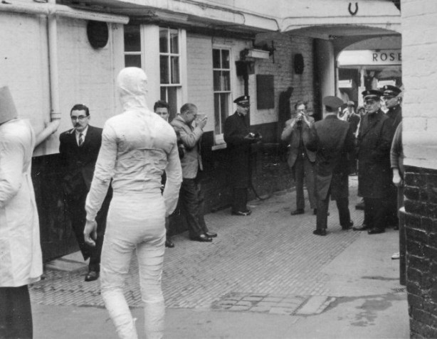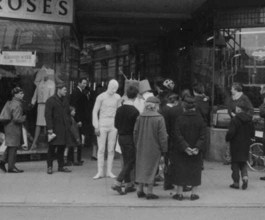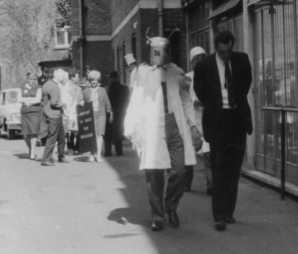 That's Charles Partington in the striped costume, probably Harry Nedler in the bughead costume with long robe and claw hand, and either Tom Holt or Tony Edwards as the Mummy. All photos are by Terry Jeeves: