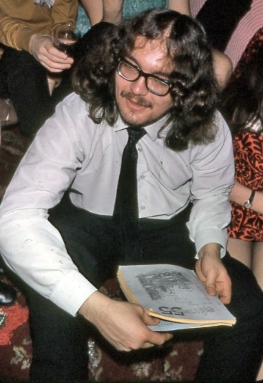 ROGER PEYTON: That was the auction, with me at the side sorting the items into suitable bundles for Mike to sell. These were the days before I had the nerve to do it myself. Mike did a few auctions in those days. Anyone know the day and time for this programme item? I'm wondering why I'm wearing a tie. PETER WESTON: We always wore ties in those days! You stopped with 1971, I carried on a bit longer before lightening-up. MARK PLUMMER: The schedule was: 15:30 Auction 16:15 Tom Morgan, Scientologist in the con hall and Tolkien Society Meeting in foyer ROGER PEYTON: Thank you Mark. That solves the problem. Sunday lunchtime, Arline and I went to an expensive Hotel up the road for lunch, and tie and suit were stipulated dress code. I'd obviously hurried back from lunch for the auction and not removed that offending object. Despite what Pete thinks, I never wore a tie unless absolutely necessary.