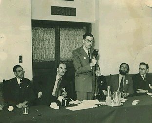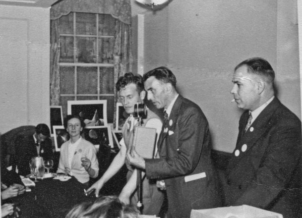 WILLIS: The Convention was due to start at 11am, and we took care and a taxi to arrive shortly afterwards so that in the event of its actually starting on time we should be on hand to carry out those who had fainted from the shock. But all was well ---at 11.30 Ron Buckmaster was still asking everyone if they had seen the microphone. Evidently someone, probably a Northerner, had taken the mike out of the Convention already. Someone suggested he should call for its return over the PA system. While the Committee were mulling over this we all milled around to the strain of Stan Kenton records. At 11.43 precisely Chairman Fred Brown apologised for the delay. He offered no explanation, and nobody expected one. He also announced the last minute cancellation of the showing of 'Destination Moon, due to the London County Council's unexpected objection to the showing of inflammable 35mm film in unlicensed theatres. Eviidently the Government had sneaked through the Cinematograph Act of 1909 without informing the Convention Committee. He also read a postcard from Peter Hamilton regretting that he might not be able to be present. Since Peter was actually standing just under the Chairman's nose, it looked as if he had delivered the postcard himself to save postage. Fred also announced the cancellation of the Junior Fanatics play, adding rather tactlessly that something better would be substituted.