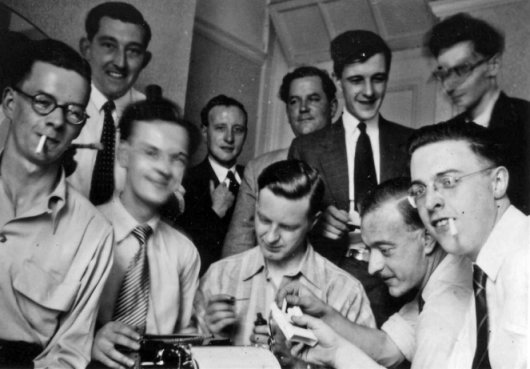 ROBINSON: Bill Temple was really on top of his form - crack followed crack without pause making his speech so good that everything else that followed that day seemed pretty dull... It could not be long before Bill made reference to the one and only Arthur Clarke. Mentioning Arthur's recent succession of book sales Bill mentioned that a fortune had been made from "The Exploitation of Space." Arthur we understand is now being referred to as Ego Head and Heinlein had called him 'The Man Who Sold The Moon.' Arthur was at present photographing sharks underwater, rumors wore that he was being investigated by Senator McCarthy for 'submersive activities'. Bill sat down to a very well earned round of applause. Other speeches in this item were by Ted Tubb, John Brunner, John Christopher and Vince Clarke - appearing in the guise of a huckster for the first time. Frank Arnold sounded very pessimistic; he said that from what little Stf he had read over the past few years, he gathered the impression that the stories were the same, the plots in fact had all been done before - I for one disagree. WILLIS: