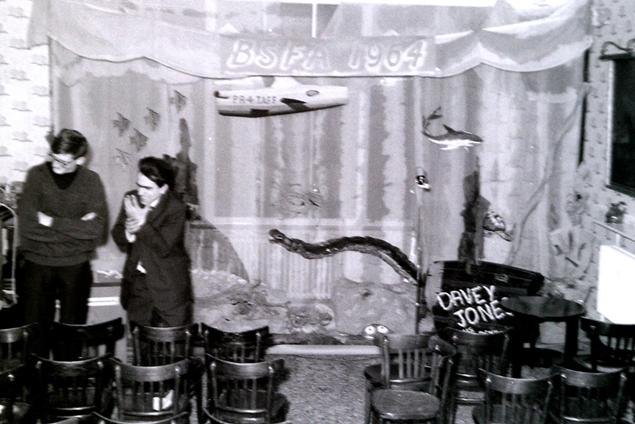 At 8 o'clock we filed upstairs for the start of the programme in the con hall. This was dominated by a huge painted backdrop held up on poles, an intricate, twelve foot tableau of some sort of undersea scene, with papier mache rocks and an old sea trunk with a rounded lid. Many years later Ken Slater explained the rationale: