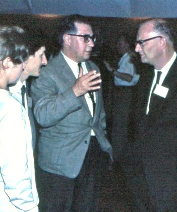 At the Hugo banquet I sat next to Brian Aldiss up front: he was the Pro GoH and I was Fan GoH. I was terrified by the prospect of having to make a speech, however short: I'd never done that before at a con. I barely touched my food, whatever it was, and Brian was wonderful in the way he chatted with me to calm me down. Tom Boardman, the toastmaster, stood up and said, 'I'm delighted to have Brian Aldiss here as Guest of Honor, but I wish the late E.E. Evans could be here with him ... so I could say that we had Aldiss and Evans too.' The attendees groaned, even as I did, but for different reasons: I was thinking that that lousy pun was probably better than anything I had to say. Tom introduced Brian, who gave a polished speech none of which I remember (I was too busy trying to keep from throwing up from nervousness), and then Tom introduced me. I have no idea what words of praise Tom used; I was too twitchy by then even to listen to egoboo, and could only sit there wishing Tom would make endless puns till the whole audience went away. But he didn't, and I had to get up and make my speech. I'd written it out beforehand, and even practiced it once or twice, but I was still terrified. When I began talking the microphone failed and somebody had to fix it; I prayed that it would dissolve and we could all go home, but that didn't happen, and there I was before the whole convention audience who waited for me to speak. (All the Hugo Banquet speeches can be heard here. For Terry, go to the 18:47 mark - Rob.) Astonishingly, I managed. I even ad-libbed an opening -- something that insulted Dave Kyle's bid for next year's worldcon in Syracuse, New York and got several laughs; I think I said, 'Next year we'll be in Cleveland unless we get lost and go to Syracuse' -- and then I went into my prepared speech. I delivered it almost word-for-word from my text, and since I've managed to save my script to this day, I can reproduce my TAFF speech here. At which point I formally announced the opening of nominations for the next election, explained the new 'Hold Over Funds' option, and sat down. The speech had drawn some laughs in most of the right places, but I'd noticed that they all came from either the first few rows in front or the last few in back; I was told later that the PA system hadn't been working quite properly, so that only those near the rear speakers had gotten the benefit of the microphone, and, since I tend to speak softly, only those near the very front had heard my voice unaided by the speakers -- so even if you were there that afternoon, this may be the first time you've had to find out what I said.
