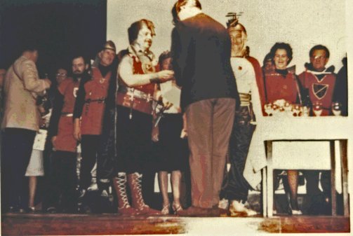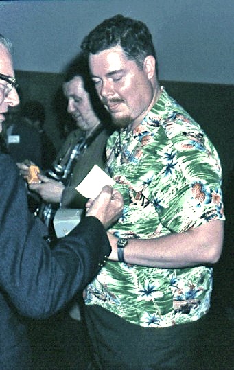 The programme's promised mystery speaker turned out to be Robert Bloch, much to the delight of the assembly. "I'm so pleased to be here today in... er," Bloch began, referring to a card, "London." He said that he was feeling a little drunk - ''George O. Smith breathed on me" - and mentioned that he was in London to make a new film, "Mary Poppins Meets the Wolfman." But it's nice to be here, Bloch said. It's nice to see Karen Anderson, and What's His Name. And John Campbell, "whose editorials I've been ghost writing for years." He said that he had had a rough trip over. He hadn't realised just how rough it had been until he saw the captain heave the anchor, and he'd also had an accident with his luggage when the port feIl out. He'd seen Westminster Abbey, the poor man's Forest Lawn, and had visited the Tower of London, though there he'd been disappointed. He'd wanted to see a Beefeater and had found himself talking to a vegetarian. Back at the hotel, he said, someone had come up to him and had asked for money to the Willis Fund. "But how can I be sure," he'd asked, "that this money will get to Willis?" "You can be sure of it," he'd been told, "l am Willis." Bloch went on to talk about some of his relatives. “Relatives run in my family," he said, "Especially when they see me coming." For example there was his cousin Mildred. “He's a nice, fellow," said Bloch, telling of the time Mildred had had his spine removed and had had to be taken home in a bucket. He was, he concluded, very glad that he'd come. “I've made my peace with God," he said. "He surrendered two weeks ago." Quite a talk. Forry Ackerman spoke about the Big Heart Award, saying that after the death of E. Everett Evans certain individuals had got together to honour those who work in fandom is often left unrecognised. He spoke of previous winners, Rick Sneary, Bjo Trimble, James Taurasi and Sam Moskowitz. This year, he said, the award is being made to someone at this side of the Atlantic. Although, Ackerman said, there, is no particular fandom in Italy or in France, there is a considerable fandom in Germany and there is one man who has done more than any other for German fandom, a man whose heart is so large that it embraces East Germany as well as West Germany. He called upon the Award's first recipient, Bob Bloch, to make the award to Walter Ernsting, the "Father of German SF." In doing so Bloch said briefly, "Don't do as I did - pawn it." Ernsting said that he was too overcome with emotion to make a speech. "This is a big surprise," he said, "and my heart is too full. And when my heart is great, then my mouth is small." He thanked those presenting the award for recognising German fandom and said that he felt that the Award was given to German fandom rather than to himself personally.