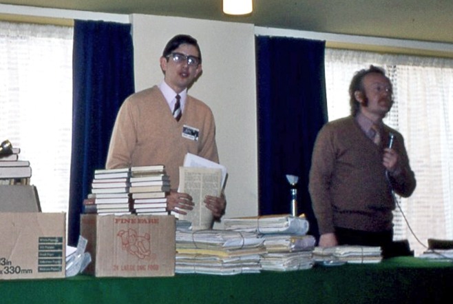 (("Fanzines Past and Present", was a fascinating snapshot of a specific moment in time when what we now think of when we recall 1970s fandom was just starting to emerge. This was followed immediately by the auction....)) ROJE GILBERT: The auction was a tragedy. Many good items went very cheaply. I wonder if fans have so much money these days? I bid 20p for "The Worlds of Robert F. Young" and no-one even spoke. I considered this a fairly worthy item when I first read it, and to pick up an SFBC edition in very good nick, just sans dust-cover, seemed robbery.