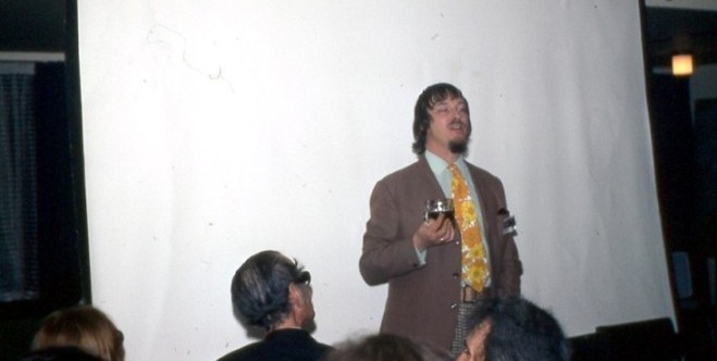 I dropped in on John Brunner's talk, which was its usual competent and interesting self. I would have stayed for Pam Bulmer's too but at that moment the bar opened, Bob Shaw appeared, and I was lost to alcohol and a Belfast accent. GRAY BOAK: I have yet to-receive confirmation that John said "CYNIC wha none"- whatever that may mean - during his speech... but I heard it! Pam's speech was rather disappointing, but that seemed largely due to her inexperience in public speaking. I look forward to reading it in QUICKSILVER.