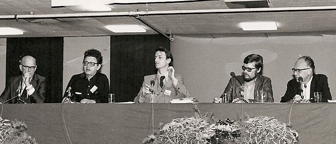 TERRY CARR: That SFWA Suite party, despite or maybe partly because of the energy generated by such rumours, was much fun and lasted till quite late. As a result, Sunday began late for me: I ran into Norman Spinrad when the Metropole coffee shop was between breakfast and lunch set-ups; Norman was hurting due to food poisoning at a Chinese restaurant the evening before and he wanted a tender breakfast. Janet Morris joined us, said she knew just the place, and we went there. It proved to be as high-quality as she'd promised, and we had a most enjoyable brunch. Janet was chagrined because she'd just had a discussion with Bantam's representatives about what sort of covers to put on the reissues of her fantasy series; she hadn't been pleased with the covers on the first printings not only because they were poor art but also because they were sexist. "And the best idea anyone could come up with for the new editions was to hire the artist who did the Gor covers!" She said she really just wanted simple covers this time, with a plain-coloured background on each and maybe the titles or bylines done in embossed lettering, perhaps a small drawing. I thought about that, and suggested that they contract with the sculptor Dale Enzenbacher to let them use small photos of some of his fantasy figures - this would certainly result in distinctive and attractive covers. She seemed to like this idea; but as to whether or not anything will come of it... " PETER ROBERTS: Sunday came along and the con seemed to have become a way of life; my hands were becoming steadier, so my system was adjusting and all must have been going well. However, the idea of Sunday morning fan panels no longer seemed all that attractive, so I checked with the panellists and rescheduled the programme to start with the final chat show (Harry Bell, Darroll Pardoe, Joseph Nicholas, and – you guessed – me chairing) at one o'clock; bright audience and receptive to the crop of fannish anecdotes and arguments. After that the fanzine auction – there weren't many but good grief they didn't half fetch high prices: up to £8 for TAFF reports and INNUENDOs and a quid or two for FOULERs and TRUE RATs. North American and British fans even kept up with some lunatic Swedish bidding. I started worrying about woodlice eating away at my fanzines stored away in Dawlish.