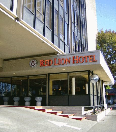 We stopped off twice on our journey, once at a gas station where I bought water and some delicious chocolate cupcakes, and once to eat a meal at a place called 'Izzy's'. Despite the name this didn't appear to be Jewish. They offered an all-you-can-eat buffet, so I did. When we arrived at the Red Lion hotel - a name that sounds like a pub to a Brit and so was instantly welcoming - we were confronted by a horde of fans milling around in the lobby, having nowhere to go.