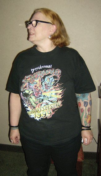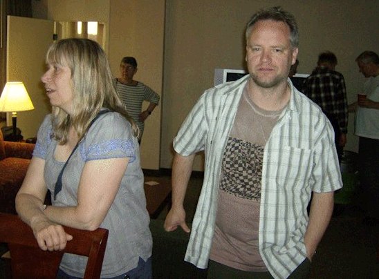 Everyone moved up to con suite when it eventually opened its doors at 7.30pm. A three-room spread at the end of a fifth floor corridor, it looked as if it would be a fine space for partying. As we entered, so Dan Steffan announced the immortal words: "The beer is in the jacuzzi!" Isn't that wonderful? I want those words on a T-shirt. Nor was he kidding. The beer was indeed in the jacuzzi, and the jacuzzi was hard up against the bar. I don't know who would design a room like that, but I want to shake their hand. Next to the jacuzzi were two beer kegs. These contained a beer everyone simply referred to as 'red'. As soon as I tried it it happily became my drink of choice for the remainder of the con. Had the con suite been open more often then I'd have drank more of it. I got a big hug from Lynn Steffan and a sweaty handshake from Dan. It was great to see them both again after so many years. Both now had longer hair, and Dan had acquired the long, shaggy beard of an old testament prophet, dark and shot through with grey.