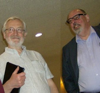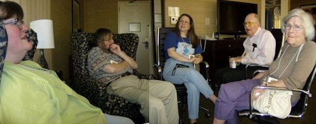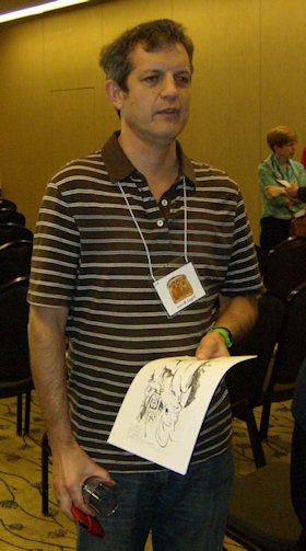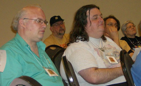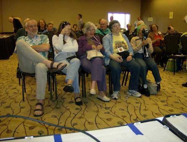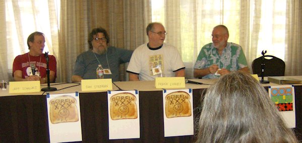 The con suite had opened by the time we got back to the hotel. I poured myself some red from the keg and we sat chatting with Linda Deneroff, Bryan, Elinor Busby, and Milt Stevens until the first program item of the afternoon in the St. John suite. This was 'The Class of 1970: A Fannish Tribal Reunion' featuring Jeff Schalles, Dan Steffan, John D. Berry, Frank Lunney, and 'Bill Kunkel's Ghost'. A fascinating panel, it covered an era of US fanhistory I know little about. Jay Kinney joined in from the audience and was quickly drafted onto the panel, as was - once again - Michael Dobson. Dan told the story of an early convention they were at where he was the only one who had a room so the others all slept on his floor. "We all had our assigned spots on the floor," explained Frank, "all except John D.Berry who announced that he would be sharing the bed with Dan. John didn't do floors; he always took the bed."