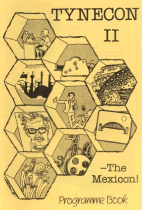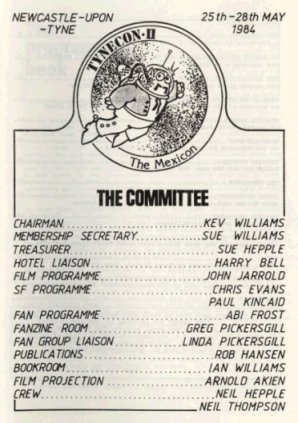 Travelled back to Upton Park later that afternoon, but had no sooner got in than we got a call from Joseph Nicholas and Judith Hanna inviting us over that evening. Another long trip across London, and it wasn't until we were almost there that it occurred to me how much easier it would have been to invite them over instead. Friday 25th May Having caught the 10.00am train to Newcastle we made MEXICON in good time, but got very hot-under-the-collar on discovering we had a twin room rather than a double. Since Greg Pickersgill had been joking about this very thing beforehand I thought dark and deadly thoughts about him, though he turned out not to be responsible. Because of my obvious anger, and despite my objections, Kev & Sue Williams insisted we take their room, so we did. After spending a while helping carry a few items in, I watched a dry run of the opening ceremony and was deeply impressed, even if the photo of me used in it made me look like a PLO reservist. I helped set up the fanzines in the fanzine room, then went to a local Italian restaurant with Avedon, Rob Holdstock, Leroy Kettle, and John Brosnan. This had been recommended by Chris Evans, and was excellent. We got back to the Royal Station Hotel in time for the Opening Ceremony proper, and this went down just as well as we'd hoped it would. My only worry now was how we could follow such a great start. As always on these occasions, the rest of the evening was spent greeting new arrivals and propping up the bar. Much amusement was provided by the looks on the faces of those exiting the showing of the movie PINK FLAMINGOES. Saturday 26th May Having to be up early for our fanhistory panel, Avedon and I had our first and only hotel breakfast of the convention. On the panel were Rob Jackson, Darroll Pardoe, Avedon and me, and what with one thing and another I ended up as the moderator. Good audience participation from people such as Joseph, Judith, and Kate Davies, someone I addressed - more than once - as Ethel Lindsay, but who wasn't. (I never met Ethel, nor had I seen a photo of her at this point, and so made an assumption - and you know what they say about them.) Our evening meal was at the Italian restaurant again, this time with Lucy, Lilian Edwards, and Christina Lake. The disco at the end of the day went well with the DJ carrying on for an extra hour free of charge, though we had problems with hotel management over the bar. I hurt my leg landing from a high leap while dancing to Frankie Goes To Holywood's 'Relax', but still went on to dance to the next record - 'It's Raining Men' - with Anne Warren, who expressed her surprise at the energy of my dancing having assumed someone so 'laid back' would have a similar manner on the dance floor. Throughout the disco, writer guest Alistair Gray lay asleep on the con hall steps, blind drunk. This man is a real find! Sunday 27th May Don't recall much about today (which'll teach me to wait 'til mid-July before writing this up), but I do recall spending some hours in the late afternoon manning the registration desk. Went for meal in the Italian restaurant (again!), returning just in time to get a good seat for THE TRANSMIGRATION OF TIMOTHY ARCHER, which was superb. Geoff Ryman and his troupe excelled themselves and the play got the biggest round of applause of any single programme item.