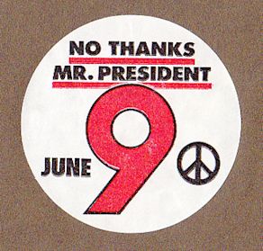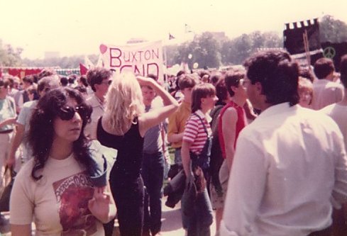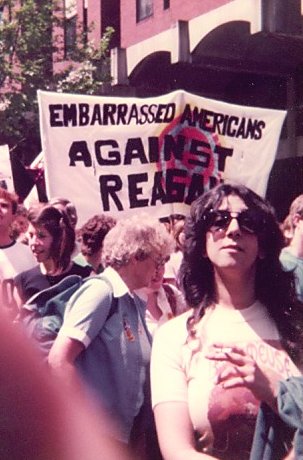 The really neat thing about marching under EMBARRASSED AMERICANS AGAINST REAGAN was watching the reactions of the bystanders. For the most part they Seemed delighted by the banner and either burst into applause or cheered or both, but some didn't. Certain elderly people, who looked like American tourists, watched stone-faced as we marched on by. This aside the response of the spectators was heady wine and the Americans around us, as well as those marching under AMERICANS AGAINST AMERICAN NUCLEAR IMPERIALISM, were all in favour of splitting off from the main body and marching on the American Embassy until it was pointed out to them that this sort of thing could result in them being deported.
