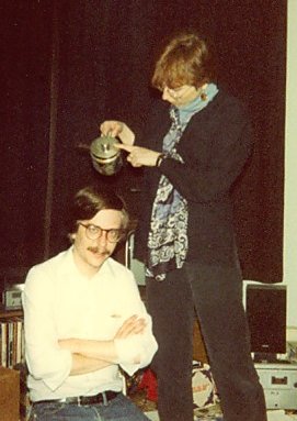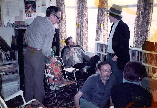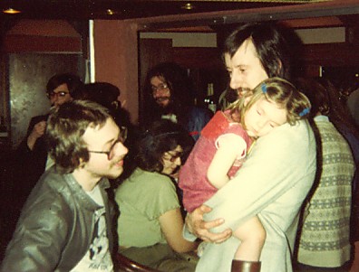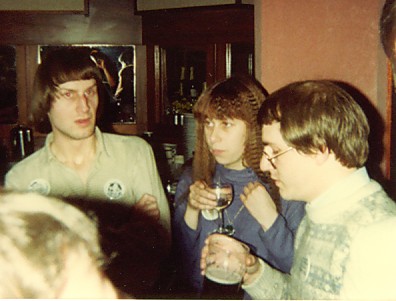 On our return to Lawrence Road we were rejoined by Alan Dorey, fresh from a mid-afternoon BSFA session and with MATRIX editor Dave Hodson in tow, and by Anne Warren, and that's when the fun really began. At one point Tom slid quietly off to bed. When this was noticed the mob stormed upstairs and dragged him back down. Then, for reasons that weren't even apparent at the time (but which may have involved alcohol) we launched into a rousing rendition of Edward Elgar's 'Jerusalem'. We tried to get Tom to give a speech, even Nixon's resignation speech ("Resign the American presidency!" I urged), but he wouldn't. However, Phil Palmer started a round-robin performing session that inevitably ended up with John Jarrold hogging the floor - the ham!