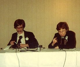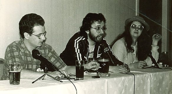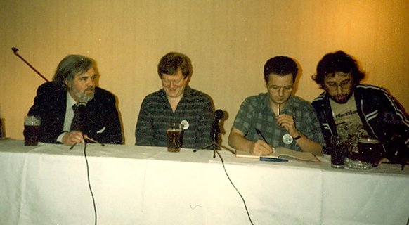 6.30pm: Debate - An informal debate on the proposition "Apas have been a shot in the arm for Fandom". Peter-Fred Thompson and Kate Davies support this against the malignant moaners Malcolm Edwards and Simon Ounsley. Difficult and bitchy questions from the floor will be sought.