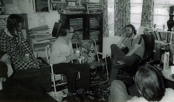 After we had all feasted on the excellent Tex-Mex cuisine of Sherry's native Texas it wasn't too surprising that the conversation turned to politics. Mike Dickinson declared himself an anarchist ("...though formerly an anarcho-syndicalist", he was careful to point out) while Sherry admitted to being a Marxist. Daunted by such company and doubtless still shaken by Joseph's earlier criticism, Avedon followed Roz in identifying herself as a mere radical. Jackie Gresham meanwhile, totally intimidated by these revelations, claimed to be 'apolitical'.