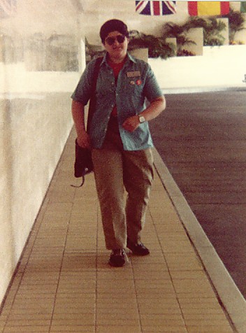 We talked for a few minutes before being joined by a tall, athletic-looking woman in a track-suit who introduced herself as Spike. She was just off for her morning jog (jogging? ... at a convention?) but was meeting Stu for breakfast at 10.30am and invited me along. I accepted, particularly as she also offered me the loan of a badly needed hair-dryer. Spike, I later learned, is probably the only person ever to come into fandom via weight-lifting and one of the many formidable woman at the core of Madison, Wisconsin's feminist-oriented SF group. I would get to know her much better over the next few years.